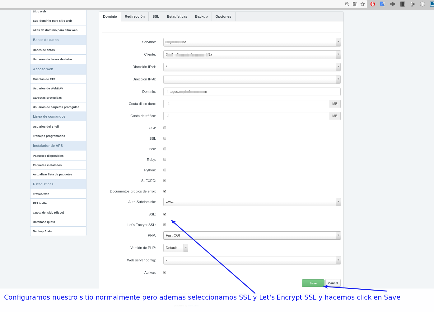3.- Configuramos nuestro sitio normalmente pero ademas seleccionamos SSL y Let’s Encrypt SSL y hacemos click en Save.