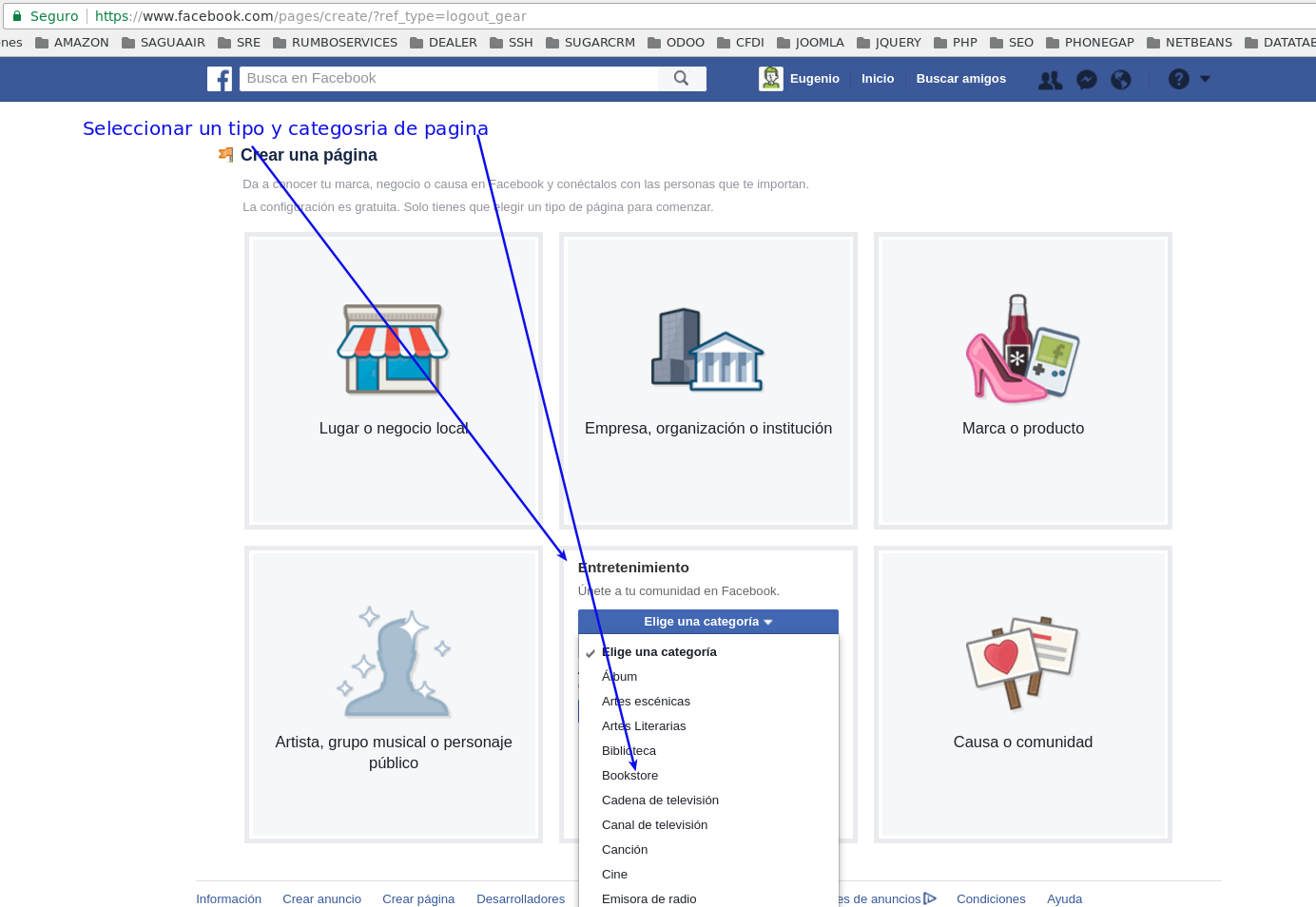 2.- Seleccionar un tipo y categoria de pagina.