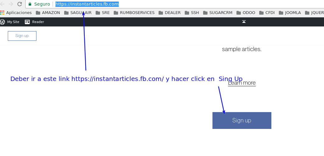 3.- Deber ir a este link https://instantarticles.fb.com/ y hacer click en “Sing Up”.