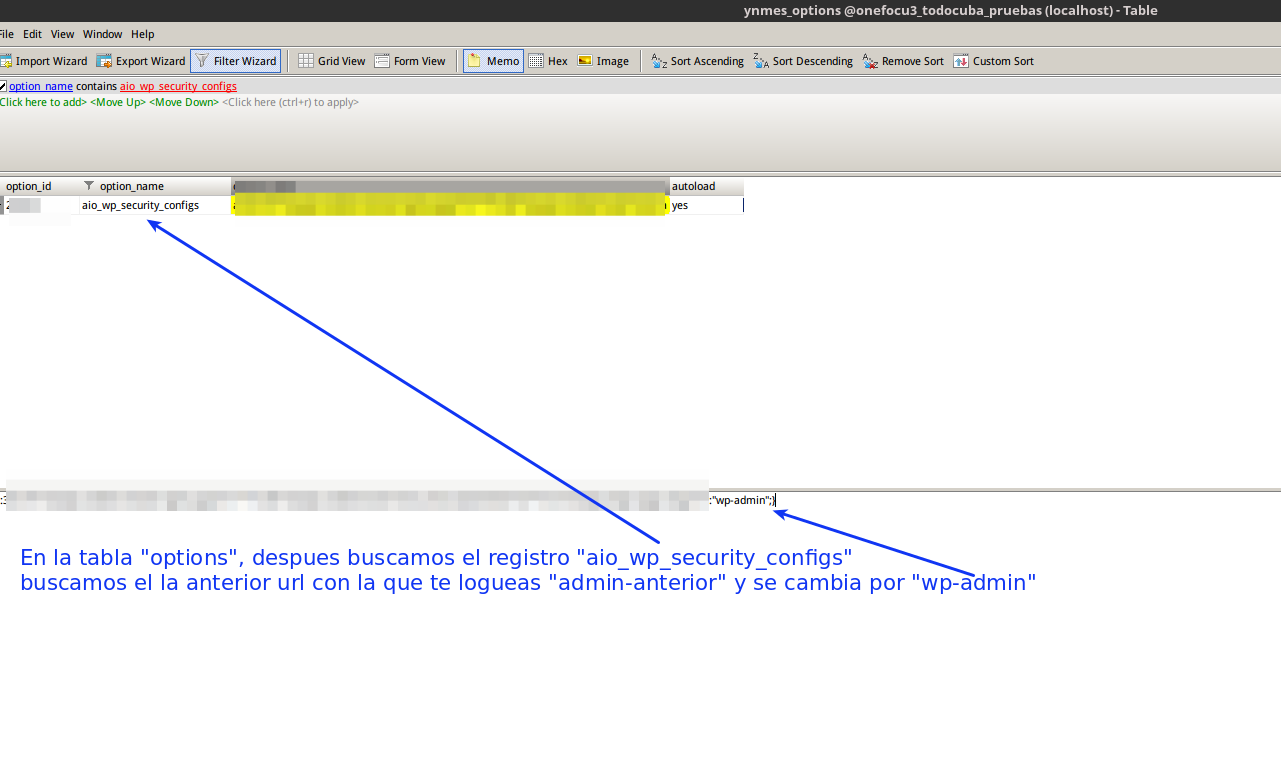 En la tabla “options”, despues buscamos el registro “aio_wp_security_configs” buscamos el la anterior url con la que te logueas “admin-anterior” y se cambia por “wp-admin”