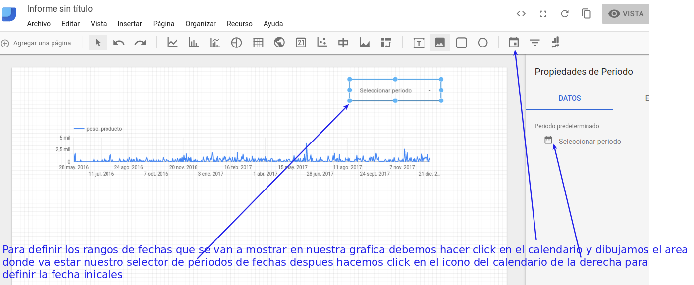 8.- Para definir los rangos de fechas que se van a mostrar en nuestra grafica debemos hacer click en el calendario y dibujamos el area donde va estar nuestro selector de periodos de fechas despues hacemos click en el icono del calendario de la derecha para definir la fecha inicales