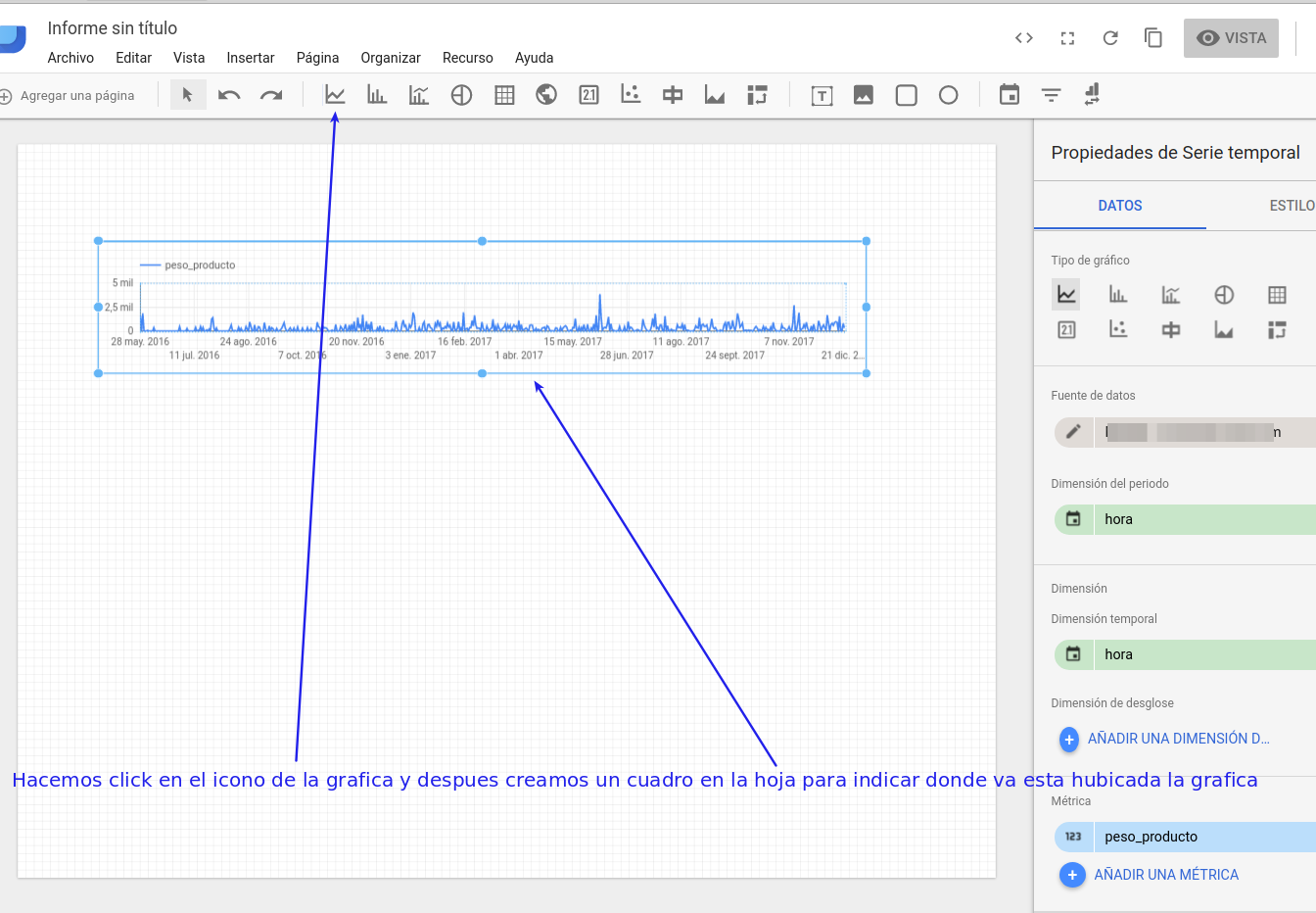 8.- Para definir los rangos de fechas que se van a mostrar en nuestra grafica debemos hacer click en el calendario y dibujamos el area donde va estar nuestro selector de periodos de fechas despues hacemos click en el icono del calendario de la derecha para definir la fecha inicales