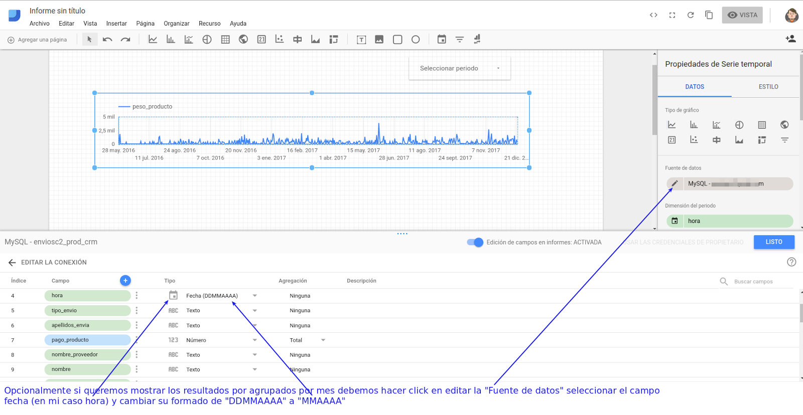 9.- Opcionalmente si queremos mostrar los resultados por agrupados por mes debemos hacer click en editar la “Fuente de datos” seleccionar el campo fecha (en mi caso hora) y cambiar su formado de “DDMMAAAA” a “MMAAAA”
