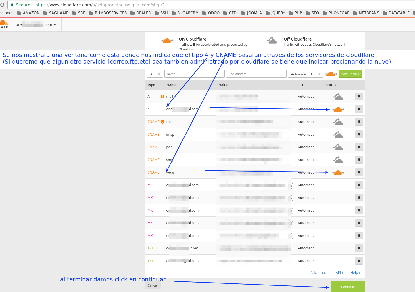 Nota importante: Por alguna razón los Cloudflare no es capaz de escanear todas las configuraciones del DNS de bluehost (A,CNAME,MX,FTP etc…) en ese caso se deben dar de alta uno por uno y de preferencia todos. Por ejemplo si no se da de alta los MX no se van a poder recibir correos para el dominio que estemos moviendo.
