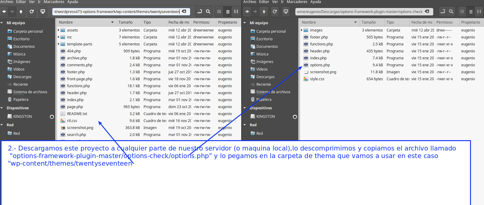 2.- Descargamos este archivo a cualquier parte de nuestro servidor (o maquina local),lo descomprimimos y copiamos el archivo llamado “options-framework-plugin-master/options.php” y lo pegamos en la carpeta de thema que vamos a usar en este caso “wp-content/themes/twentyseventeen”